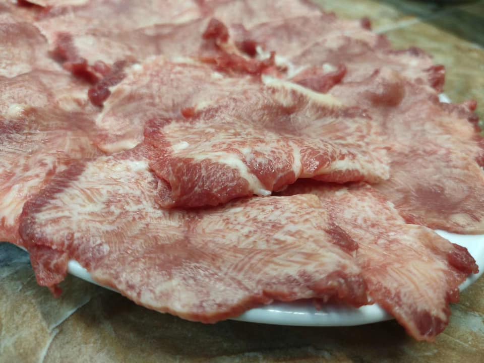 牛舌,作為潮汕牛肉火鍋係必食嘅部位,肉質軟得黎又彈口,食牛舌最主要係師傅刀工,切細細薄片,淥大約8秒最佳狀態,通常一條牛舌只可以切出五分之一牛舌芯部位,紅色一片片有白色花紋,係牛舌最好食嘅部位。